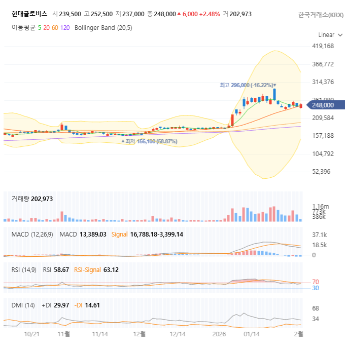 - 조심해야 할 신호들: 고점(296,000원) 대비 약 16% 하락하며 변동성이 커졌습니다. 볼린저 밴드가 넓게 벌어져 있어 가격 등락 폭이 클 수 있으며, RSI가 58 수준으로 과열권은 아니지만 방향성을 탐색하는 구간입니다. 296,000원 전고점 돌파 시 거래량이 충분히 실리지 않는다면 쌍봉을 찍고 하락할 위험도 있습니다.