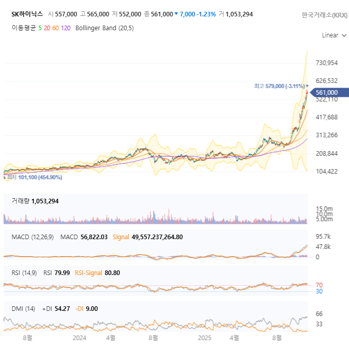첨부된 SK하이닉스의 일봉 차트를 분석한 결과, 주가는 견고한 상승 추세 속에 단기 조정을 거치고 있는 것으로 보입니다. 시장의 관심과 실적 모멘텀이 주가에 고스란히 반영되고 있습니다.